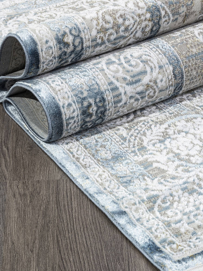 Коротко: «Ковер AJMAL LP 292 CREAM / BLUE» (AJMAL, SIRMA, Турция) — ковер для дома, гостиной. материал: полиэстер, стиль: в классическом стиле, цвет: серый, синий, кремовый, ворс: 10 мм, плотность: 462000 точек/м², основа: джутовая, ориентирован на классическую подачу, страна производства: Турция.