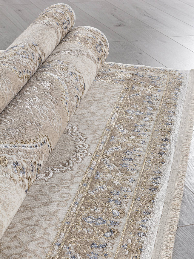 Коротко: «Ковер MOSSO 27226 BEIGE / BLUE» (MOSSO, KARDELEN, Турция) — ковер для дома, гостиной. материал: полипропилен + Полиэстер, стиль: в классическом стиле, цвет: кремовый. бежевый, синий, ворс: 8 мм, плотность: 256000 точек/м², основа: джут, ориентирован на классическую подачу, страна производства: Турция.